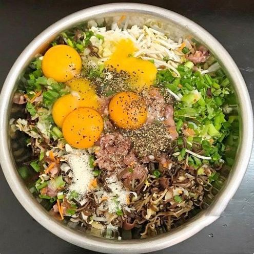 Cho tôm và thịt vào tô, ướp gia vị bao gồm muối, hạt nêm và các loại nguyên liệu đã sơ chế ở trên vào trộn đều. Sau đó cho thêm trứng gà vào và tiếp tục trộn đều phần nhân.