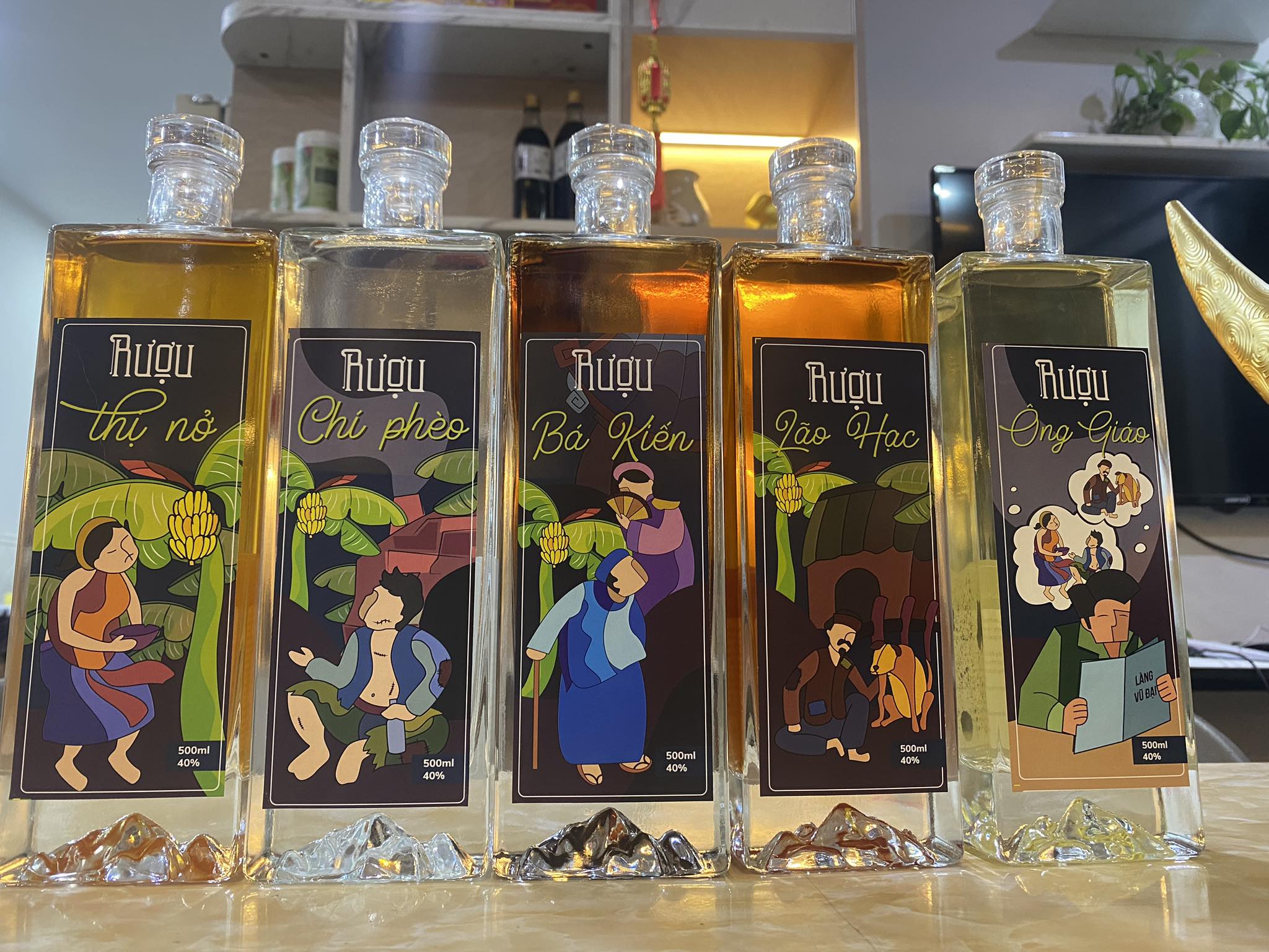 Điểm nhấn đầu tiên của bộ rượu này chính là thiết kế vô cùng ấn tượng, chủ đề chính cho mỗi chai rượu được lấy cảm hứng từ những nhân vật trong tác phẩm làng Vũ Đại ngày ấy là Chí Phèo, Thị Nở, Bá Kiến, Lão Hạc, ông Giáo. Đi cùng với hình ảnh các nhân vật đó là hình ảnh bụi chuối - nơi làm nên mối tình vô cùng đặc biệt của Chí Phèo - Thị Nở, là mụ vợ Ba của Bá Kiến - người vợ được nhắc tới nhiều trong tác phẩm, hay chú chó Vàng - nhân vật đặc biệt không thể tách rời của Lão Hạc. Còn với Ông Giáo thì đương nhiên là những cuốn sách, nơi gửi gắm bao nhiêu trăn trở của ông về hiện thực xã hội nơi ông đang sinh sống ,đó là làng Vũ Đại.